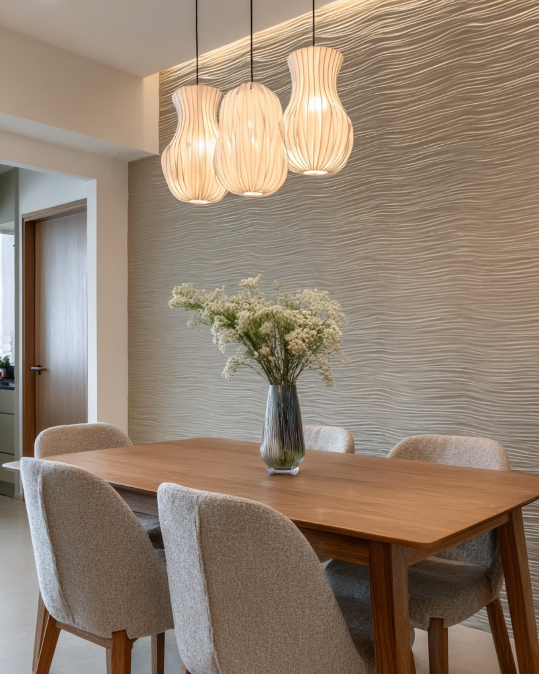 - Dining Area: The stunning wavy-textured feature wall provides a serene, artistic backdrop for the dining space. A trio of elegant, lantern-like pendant lights hangs above a simple wood table, creating an intimate and stylish setting.