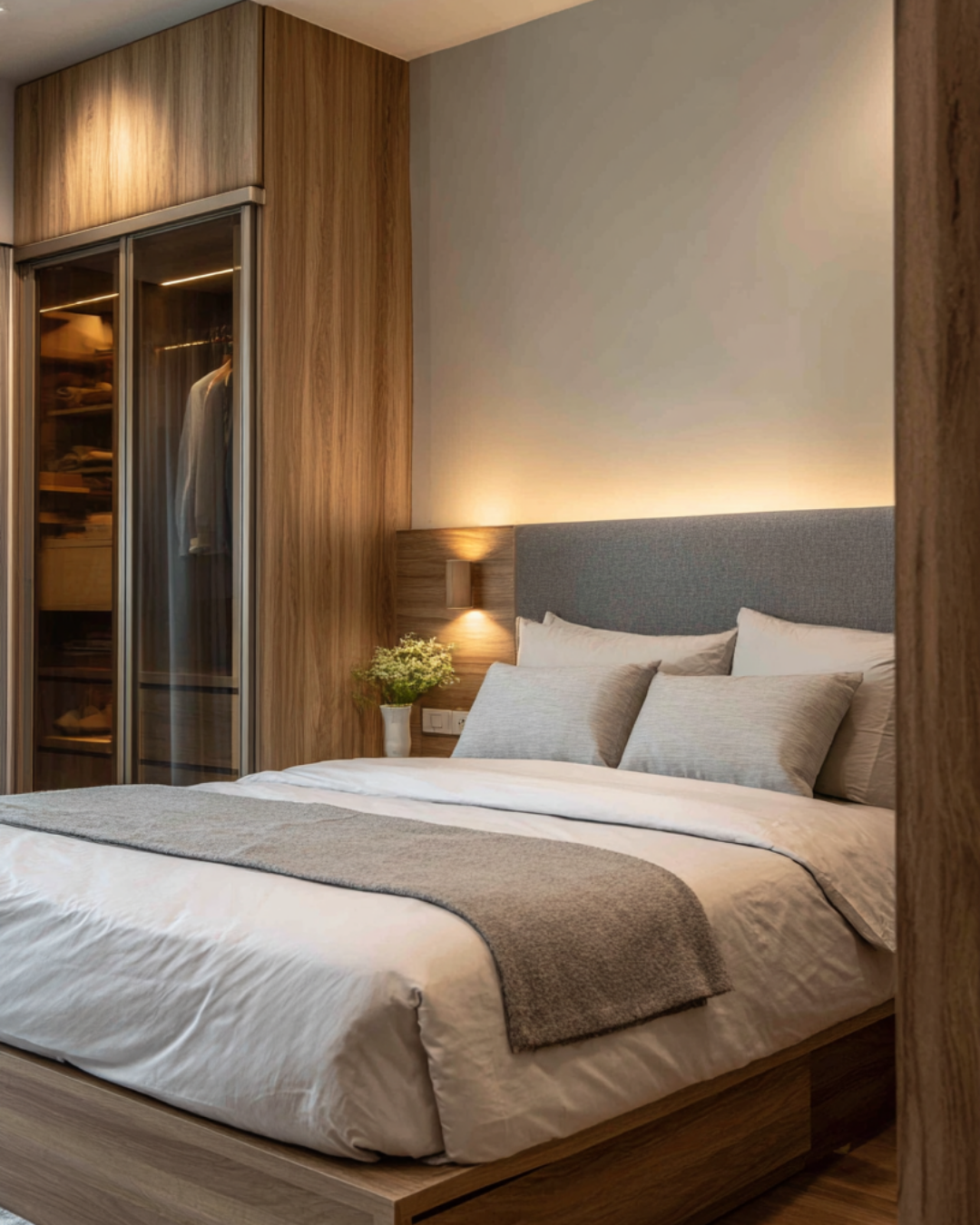 - Master Bedroom: A haven of rest, the master bedroom features a wood-paneled feature wall and a fabric headboard. A glass-paneled wardrobe adds a touch of modern sophistication while keeping the space feeling open.