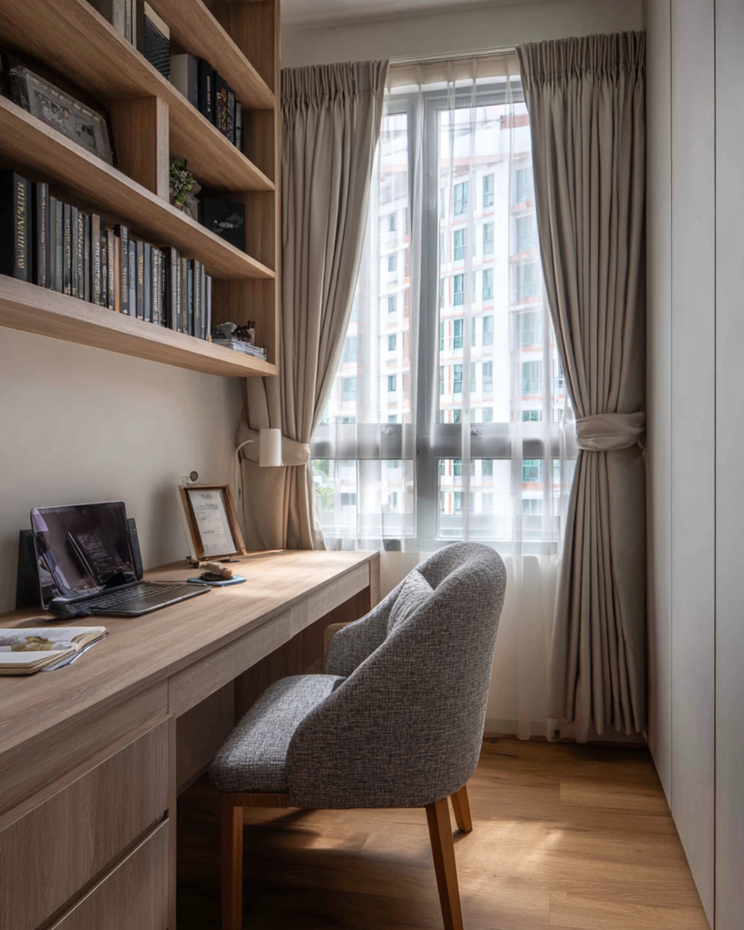 - Study Room: A floor-to-ceiling bookshelf and integrated desk in a light wood finish create a productive and inspiring workspace, bathed in natural light from the large window.