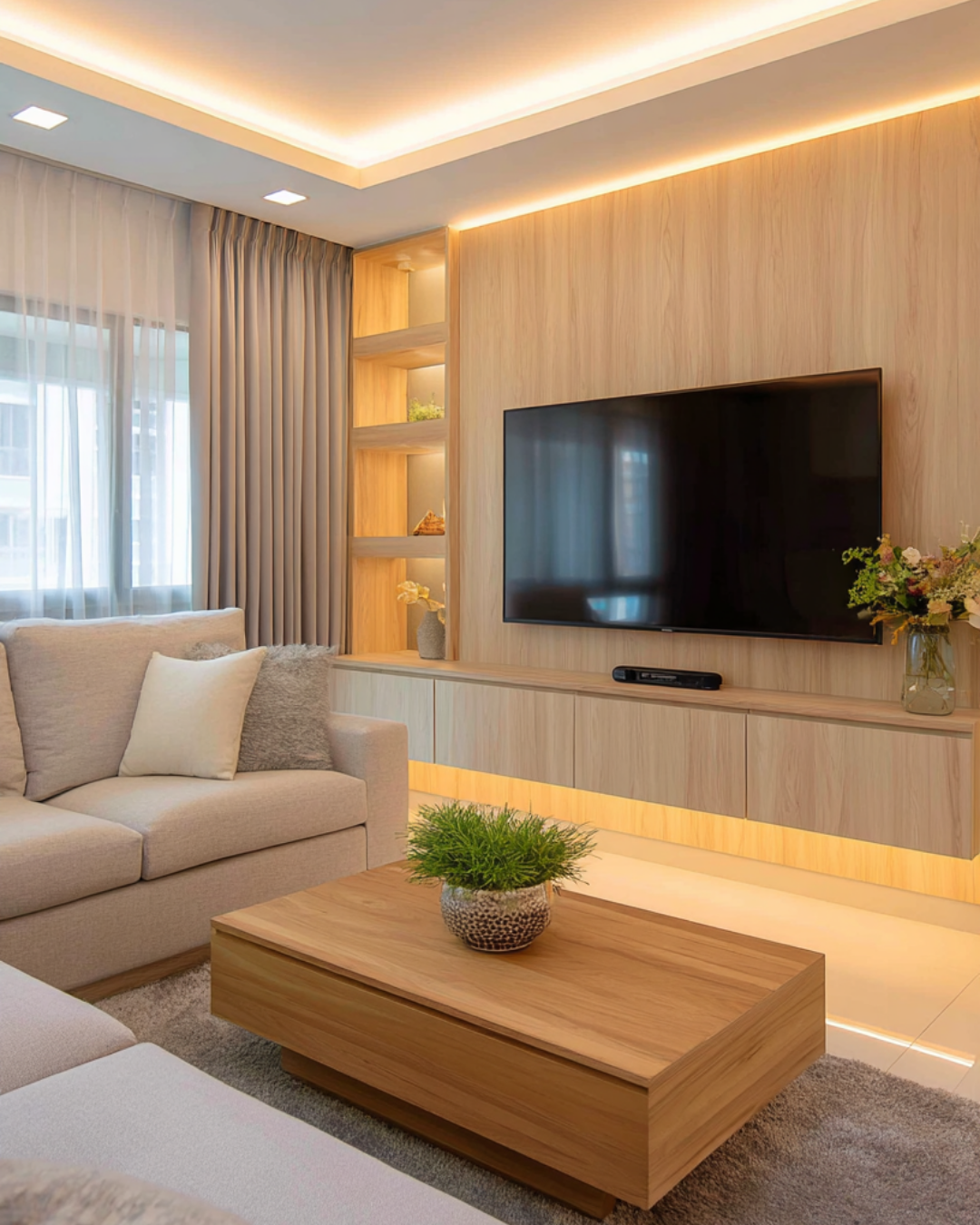 - Living Room: A full-height timber-look feature wall creates a warm and inviting focal point, seamlessly integrated with a floating console. Cove lighting enhances the architectural lines, casting a soft, luxurious glow throughout the space.