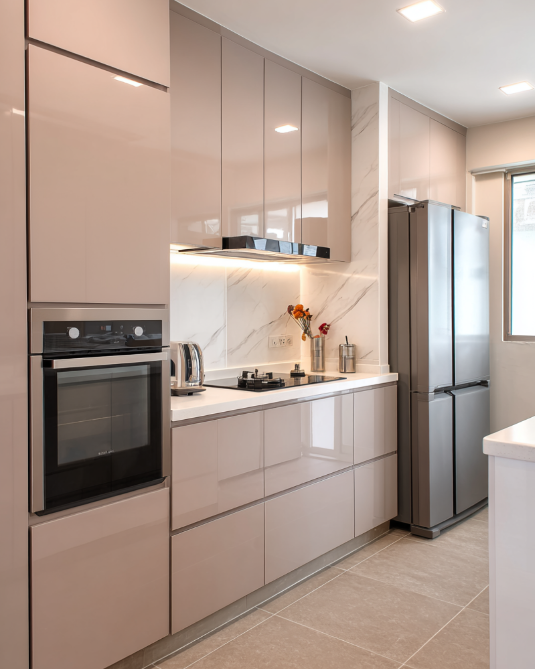 - Kitchen: Sleek, high-gloss cabinetry in a warm taupe finish is paired with a luxurious marble-effect backsplash. The result is a highly functional kitchen that exudes modern elegance.